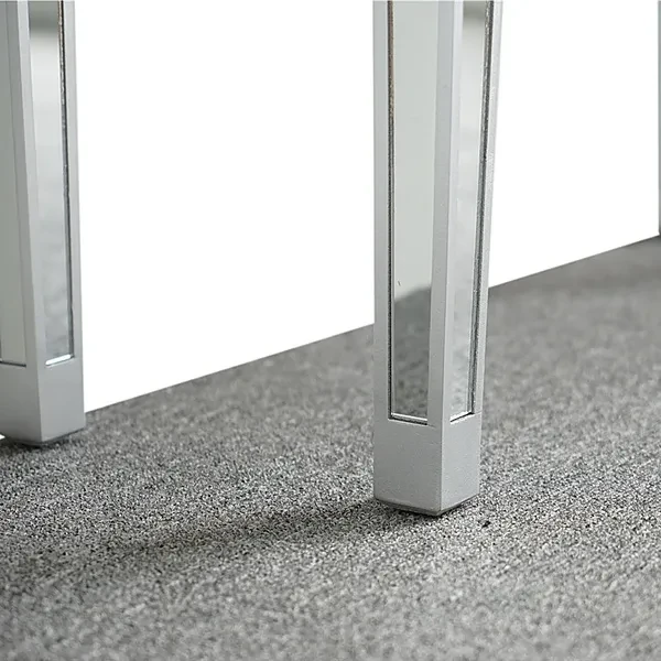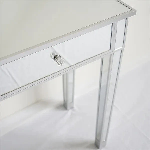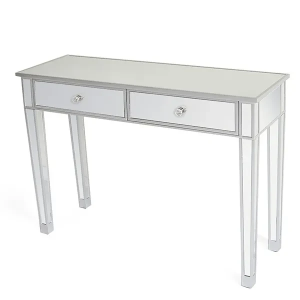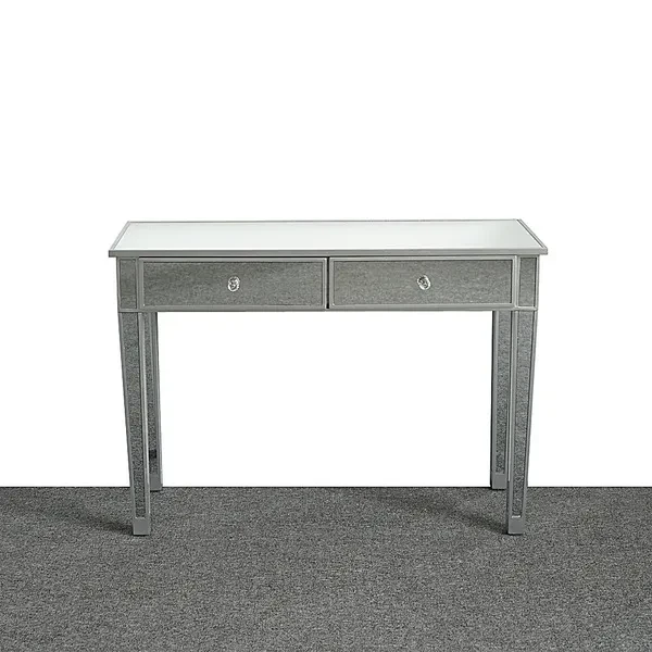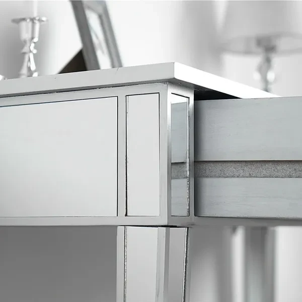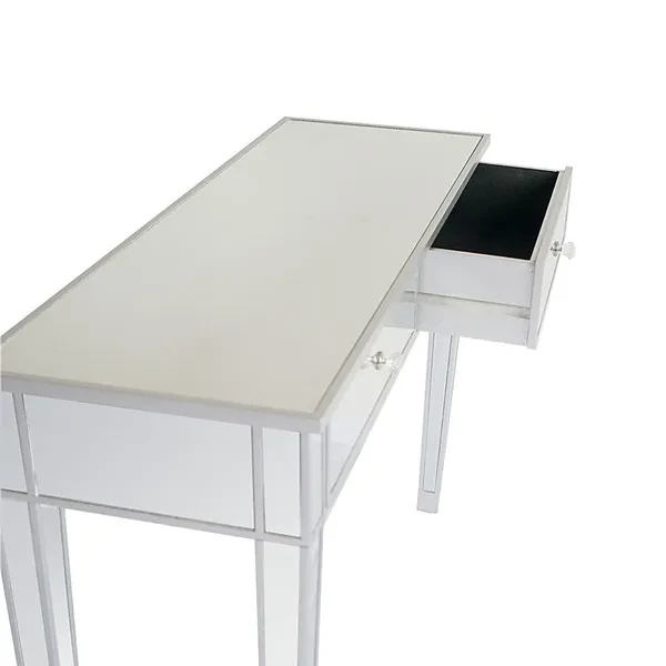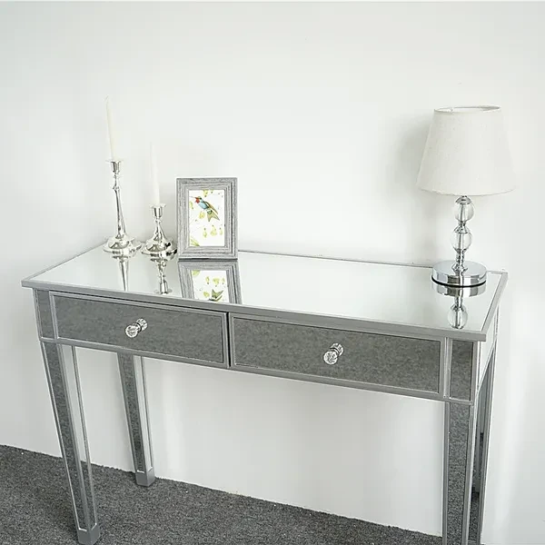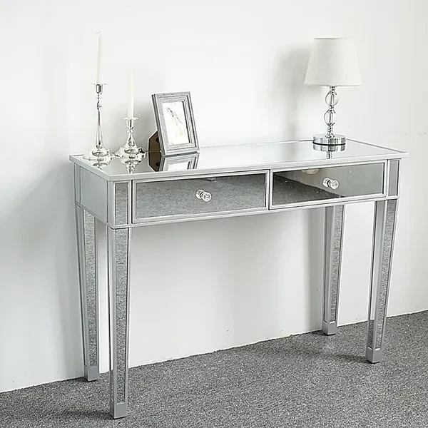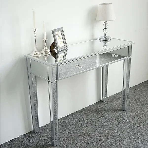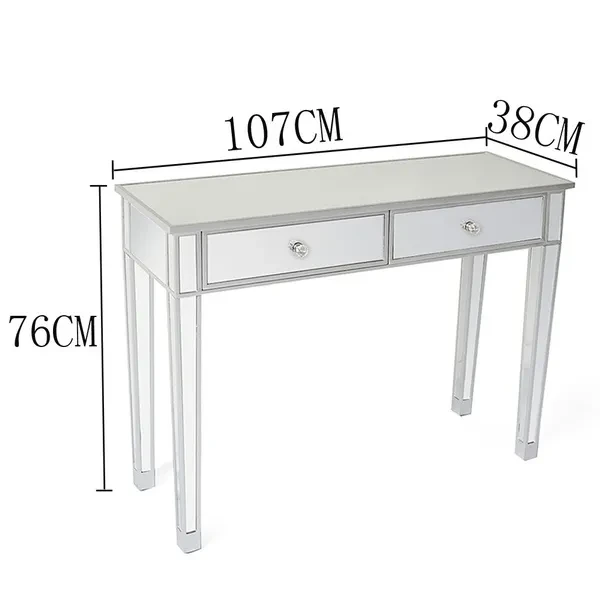 This is our 2 drawers glass mirrored makeup table, which has a beautiful appearance. It is perfect for any room, this mirrored makeup table will glamorously complement your home. With its mirrored finish, it adapts to any surroundings without overpowering yet, catches your eye with its unique presence. Shimmering mirror reflects across the composition. The practical size and function works as well in the living room as it does in the bedroom. Do not hesitate to buy one!