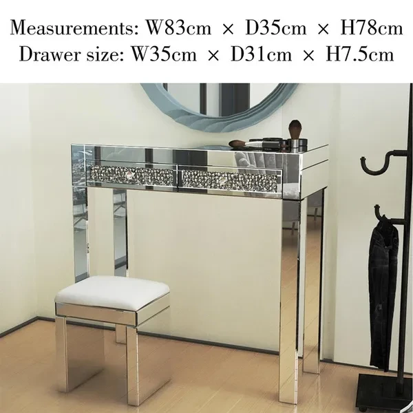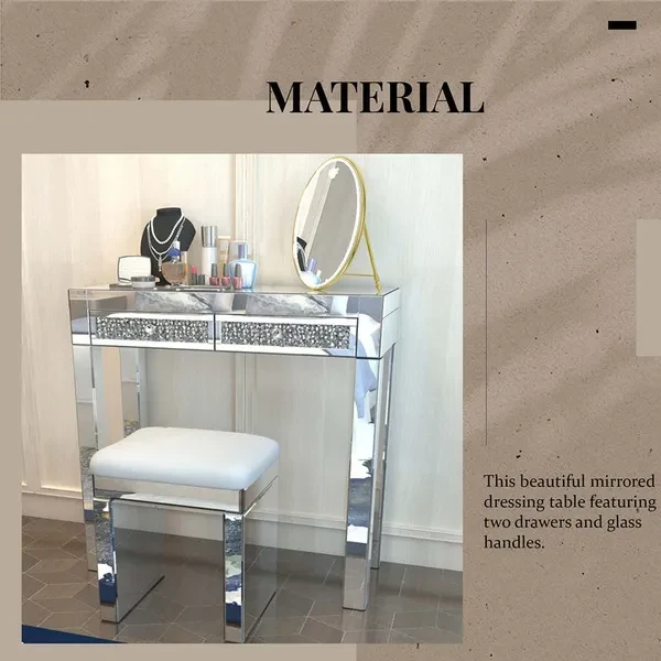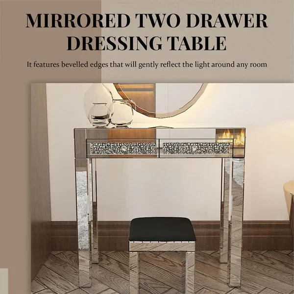 As part of our Milan mirrored furniture range, this beautiful mirrored dressing table featuring two drawers and glass handles will add some film star glamour to a bedroom or dressing room. Stool sold separately.