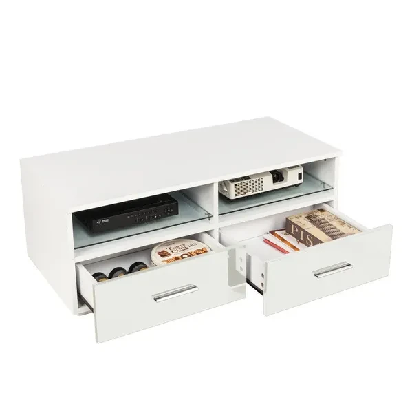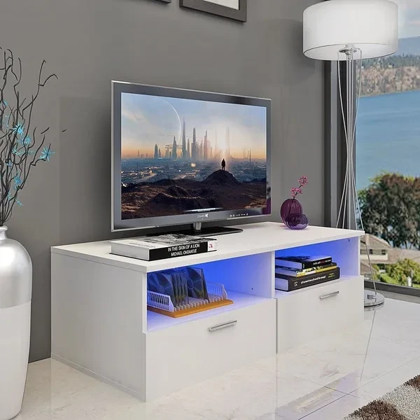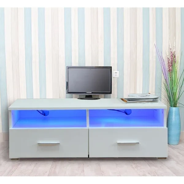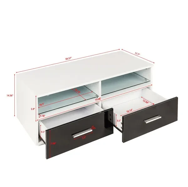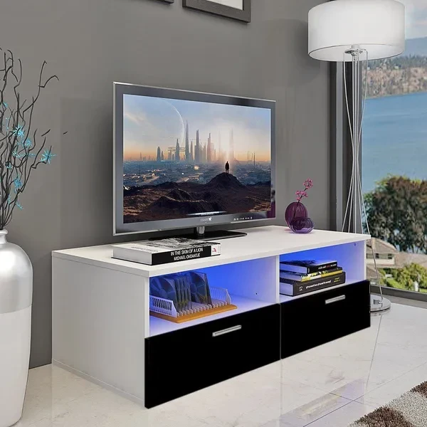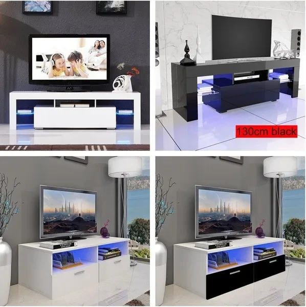NOTE:POBOX is too small for this item. 130cm LED TV Cabinet : This beautiful and modern TV unit is excellent furniture for any living room, with the product available in a variety of colours. The TV stand also features two glass shelves which have LED lighting. Features: The unit is 130cm long with a drop-down door with a push-to-open system. 2 stylish glass shelves can be lit by the included blue LED light. The unit is finished in matt white/black body with a white/black high gloss door. Supplied flat pack - home assembly required. Specifications : Material: MDF + Glass + LED Lights Size: 130 x 45 x 35 cm / 51.2" x 17.7" x 13.8" ( W*H*D) -------------------------------------------------------------------------------------------------------------- 100cm LED TV Cabinet Features: 1. New and in a good condition 2. Made of superior particle board material with meticulous treatment 3. Good hardness, high strength and durability 4. Two drawers for storing items, room-saving design 5. Elegant enough for adding special charm to your house Specifications: 1. Material: Particle Board 2. Dimensions: (39.37 x 17.72 x 14.57)" / (100 x 45 x 37)cm (L x W x H) 3. Weight: 65.04 lbs / 29.5 kg Package : 1X LED TV Cabinet with Blue Light 1X Instruction Manual