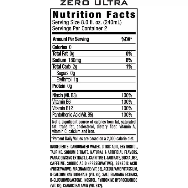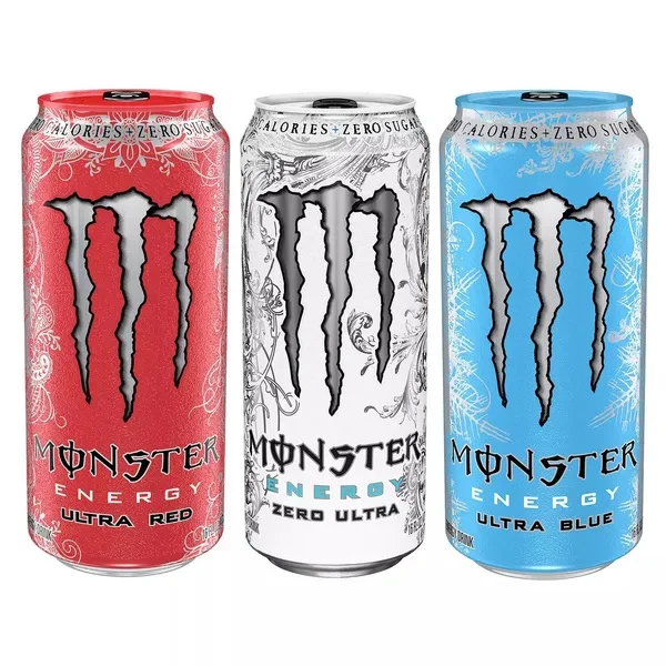This variety pack contains twenty-four 16-ounce cans of Monster Zero Ultra cans, including eight Monster Ultra Blue flavor, eight Monster Ultra Red flavor and eight Monster Zero Ultra, some of Monster's most popular berry and citrus flavors. Each refreshing drink has zero fat and zero sugar. They're made with a special blend of carbonated water, natural and artificial flavors, caffeine and vitamins.
