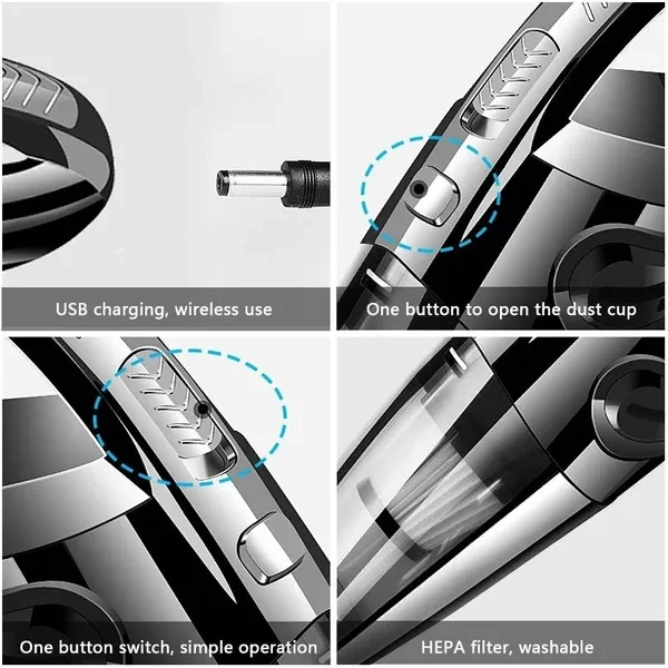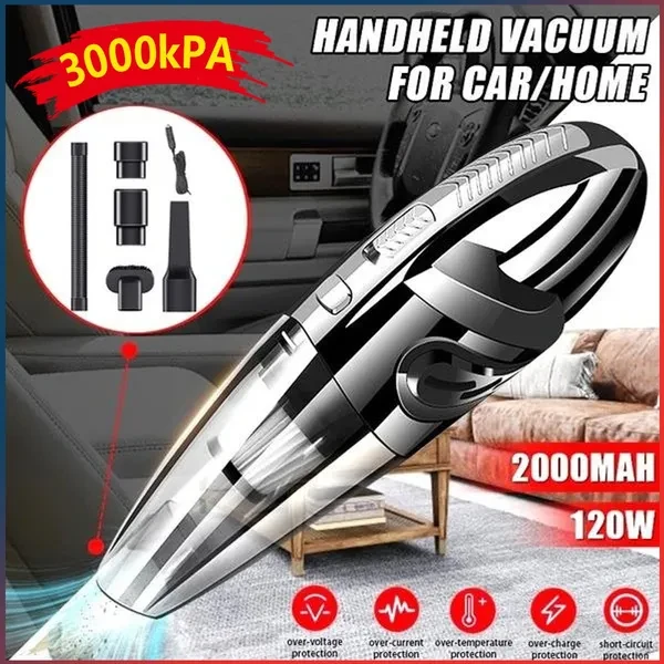 ☆Hello! Welcome to my store!! Have a good shopping time!! HEPA filter, powerful suction for thorough cleaning. One button for dust pouring, easy to clean. ◑ Description ◑ Features [product name]: hand held vehicle vacuum cleaner [product color]: black [working voltage]: 100v-240v AC aluminum battery charging [Vacuum degree]: 3000kpa [rated speed]: 29000-31000rpm [lithium battery capacity]: 2000mAh [rated power]: 120W ◑ [instructions for use]: 1. Check for sufficient charge 2. Just turn the switch on 3. Change the suction nozzle according to different occasions 4. This product is a dry and wet vacuum cleaner. When absorbing water, the front cover should be opened in time to drain water 5. The USB display of rechargeable battery indicates normal charging in red and full charge in green 6. The charging time is about 3-4 hours, and it can be used for about 20 minutes ◑ [precautions]: 1. When using, the filter must be installed 2. Do not use in direct sunlight, high temperature and high pressure 3. Do not use gasoline or volatile detergent to wipe the body 4. The front housing must not be removed when the motor is rotating 5. This product is a vehicle tool. Children are not allowed to use it alone to avoid danger 6. Attention should be paid to the height of accumulated water in the front cover when absorbing moisture 7. When removing the foreign matter in the gap, please put on the duckbill straw. 8. In normal condition, it can be used for half an hour, and has no effect on the battery of your car 9. After using the product, please turn off the switch, when removing the civilian objects from the net bag, press the fastening button, and then pour out the foreign matter 10. In order to make the dust collection effect better, it is necessary to clean the filter bag regularly when the vacuum cleaner is not used, the power cord can be rolled up for storage 11. Maintenance of this product should be in accordance with the requirements of the manual, and at the same time should keep the filter part of the product clean at all times ◑ Move to and click tag 【STORE Rating】to buy more products you need in our store by touching 【Visit Store】. We look forward to your five-star comments
