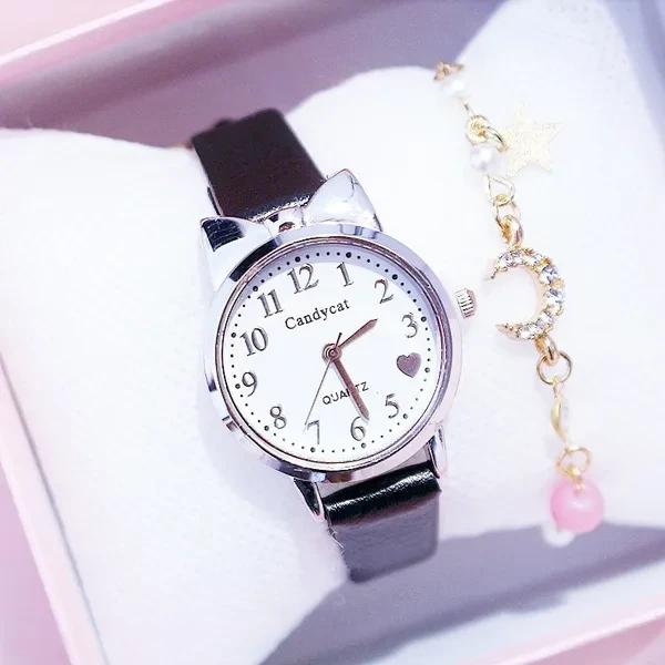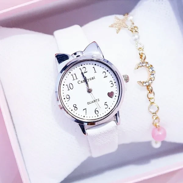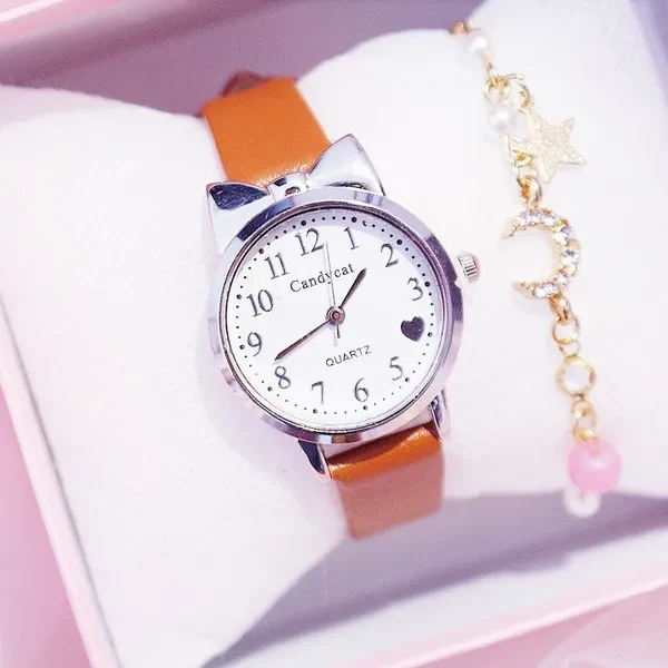 Feature: 100% New and high quality Gender :Student child girl Fashion Lovely And High Quality Trendy Watch! Movement: quartz watch Surface diameter: 2.7CM Dial thickness: 0.8CM Strap width: 1.4CM Strap length: 23CM Band material:Leather Case material: Alloy Perfect gift for Student child girl. suitable for any occasion(party, business, casual , daily life). Package contains : 1 x watch (excluding retail packaging box and bracelet)