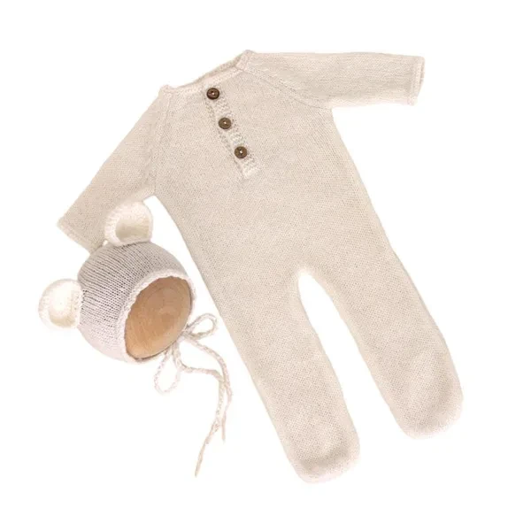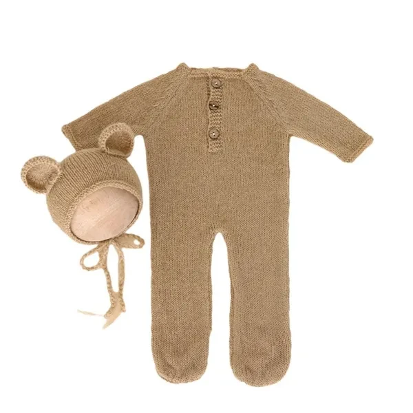 Newborn Photo Props Mohair Bear Costume Bonnet Hat Baby Footed Romper PhotoShooting Clothes Photostudio Accessory 2PCS OUY