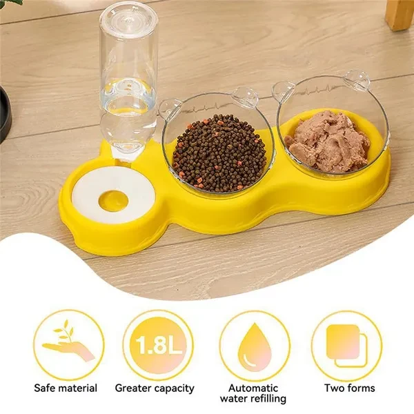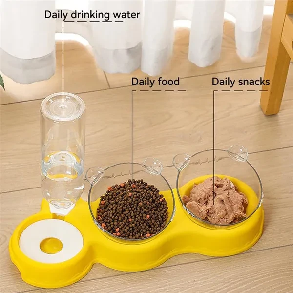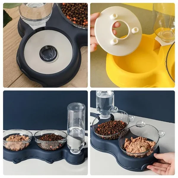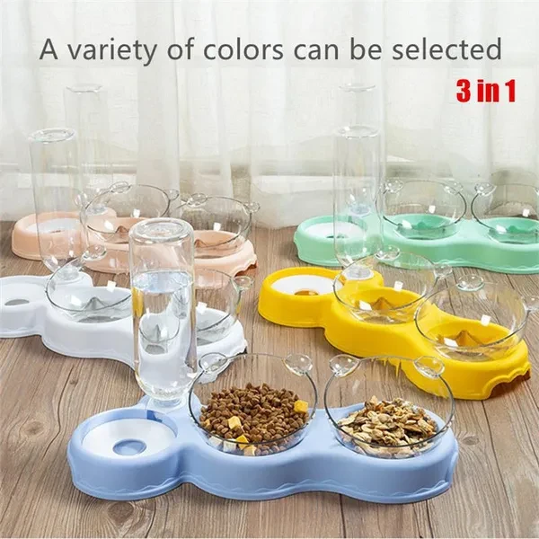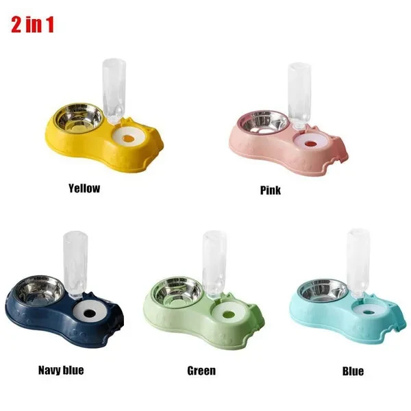 Material: PP + stainless steel 3 in 1 size Tray size: 38 * 16.5 * 2cm 2 in 1 size Size: 33cm / 12.99 "* 25cm / 9.84" * 19cm / 7.48 " Water bottle capacity: 500ml Color: light blue, green, white, yellow, pink, grey, Navy blue Product features: 1. 3-in 1 Cat Food and Water Bowl Set: Two cat bowls are designed for dry wet depart, and it allows multiples pets to eat at the same time 2. Automatic Water Supply Cat Bowls: Siphon principle for stable control of water level and automatic water supply, anti-rust SUS spring keeps every drop fresh, 500ml large capacity water bowls can meet 2-3 days need. 3. Raised Rotatable Cat Bowls : 0-15° tilt protect the cervical vertebrae, 360° rotatable cat bowls provide more space for pets to eat from different directions. 4. Easy to Use Cat Bowls: Detachable parts makes it easy to clean, 4" lip height to catch crumbles and spills. 5. Personalized color contrast, three colors optional, fashionable and durable, suitable for all kinds of home decoration style environment