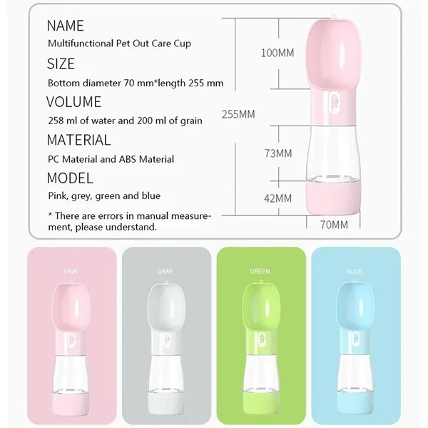feature: 1. Easy to use: Water can be pushed out with just one tap, no need to press. 2. Segmented design: the upper part is a water cup, and the lower part is a food container. 3. Food-grade ABS: Heat-resistant ABS meets FDA requirements to ensure that pet water bottles are safe and non-toxic, and keep pet dogs or cats healthy and powerful. 4. Leak-proof: The silicone seal ring design ensures that water will not leak into your bag. 5. Portability and convenience: reasonable capacity, very suitable for walking and traveling with dogs or cats. product description: Style: portable bottle, water bowl Product type: pet portable bottle Material: PC, ABS Color: pink, green, grey, blue Seasons: all seasons Size: 7 * 25.5cm Target audience: dogs Dog size: small, medium Water bowl Color: blue, pink, grey, green Size: 9*13cm Material: ABS Package includes: 1pc*portable bottle/1pc*Water bowl notes: 1. Due to manual measurement, please allow a difference of 1-3 cm, and the difference between different colors, please allow 3-5 grams. 2. Due to screen differences, the color may be slightly different from what you expect, please allow.