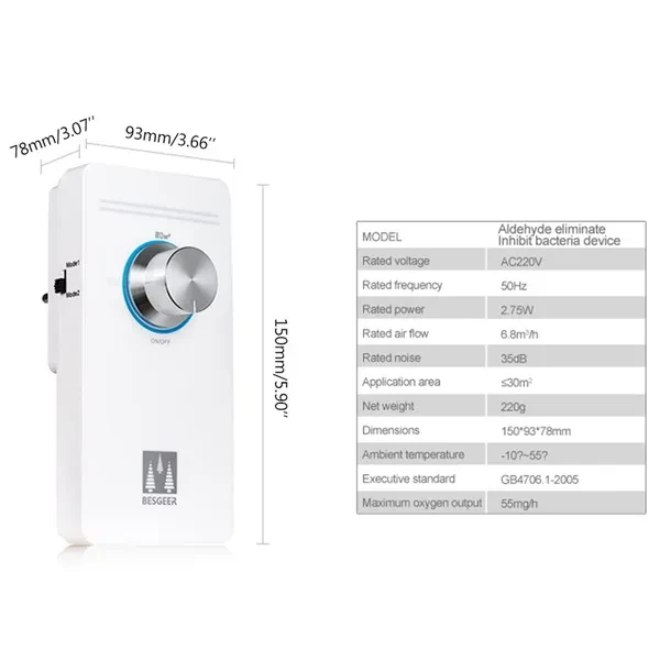 EU Plug in Ozone Air Purifier O3 Generator Machine for Room Office Bedroom Toilet Home Travel Descriptions: Aldehyde-eliminating anti-bacterial device uses the corona release technology with the latest high-temperature ceramic tube as the medium. The potent ozone genrated can effectively inhibit the growth of harmful of harmful bacteria and eliminate oders. The machine dual-mode is ptional. Once the mode 2(Intelligent Auto Mode)is set,the machine is under 24-hour cycle operation,which overcomes the trouble of frequently turning on and off machine.Mode 1(normally open mode)has better effects on the target space where pollution is more serious. The ozone quantity is limitless and adjustable. The macine is suitable for the space below 30 square meters. Specifications: Pulg Type: EU Plug Rate Power:2.75W Standby power:0.19W Rated Air Flow: 6.8m3/hour Rate noise: 35dB Applicable area: ≤30m2 Size: 150*98*73mm Applicable temperature: -10℃~55℃ Maximum yield of Ozone: 120mg/h NOTE: This product uses the working principle of generating ozone with the corona release technology.Ozone has a strong oxidation with light Houttuynia oder,which may discomfort a par of population.Therefore,we recommend that user should choose the smart mode to enjoy healthy life. Package included: 1 Set Plug in O3 Air Purifier Ozone Generator Machine