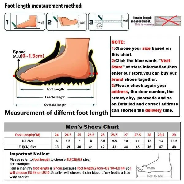 size: Please note. Simple packaging, in order to better protect the shoe CN/EU 38= US 6= Foot Length 240mm CN/EU 39= US 6.5= Foot Length 245mm CN/EU 40= US 7= Foot Length 250mm CN/EU 41= US 8= Foot Length 255mm CN/EU 42= US 8.5= Foot Length 260mm CN/EU 43= US 9.5= Foot Length 265mm CN/EU 44= US 10= Foot Length 270mm CN/EU 45= US 11= Foot Length 275mm CN/EU 46= US 12= Foot Length 280mm CN/EU 47= US 13= Foot Length 285mm CN/EU 48= US 14= Foot Length 290mm Size:38,39,40,41,42,43,44,45,46,47,48 Why buy from us? Worldwide fast shipping! Free tracking number! Quickly and satisfying communication! Unique high-quality goods! Best prices! Please reference our size picture carefully! Measured by hands, please allow 1-3mm error! Due to computer monitor, may exist some color error, please do not mind!