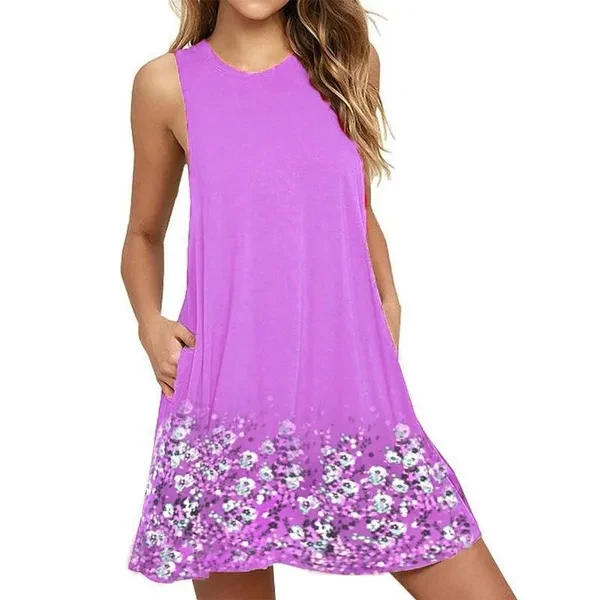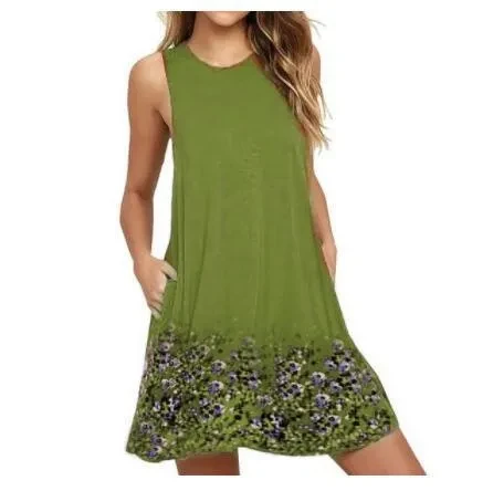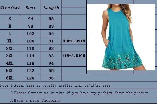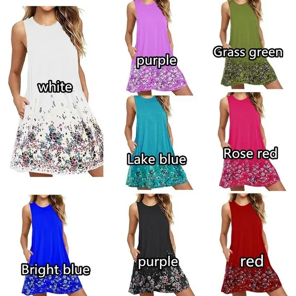 Plus Size S-6XL Summer Women Casual Round Neck Floral Printed Loose Sleeveless Beach Tank Top Holiday A-line Pocket Dresses Sexy Short Club Party Mini Halter Midi Dresses Robe Knee Length Pleated Skir