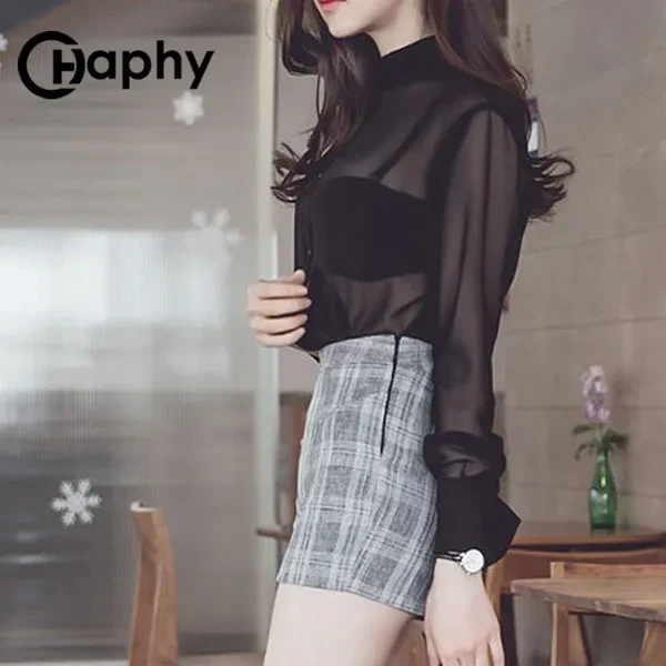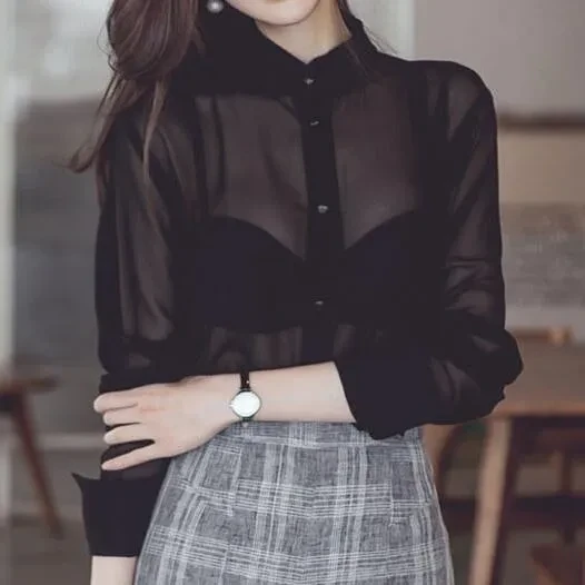 Gender: Women Collar: Turn-down Collar Style: Office Lady Sleeve Style: Regular Sleeve Length(cm): Full Material: Polyester Model Number: NRJHYZJ1101 Clothing Length: Regular Brand Name: OHAPHY Pattern Type: Solid Fabric Type: Chiffon Decoration: Button Color : Transparent Black Design: Sexy See Through Transparent Chiffon Blouse Style: Turn Down Collar Transparent Blouse Pattern Type: Sexy Turn Down Collar Transparent Sexy See Through Blouse Suitable For The Season : Spring Summer Autumn