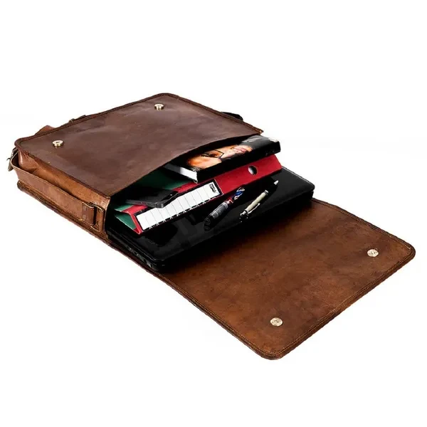 Key features * Hand-polished full-grain goat leather – smooth minimalist finish that gains a rich vintage patina. * Slim 16 × 12 in (41 × 30 cm) – carries 15-16″ laptop, A4 folders and notebook with room to spare. * Low-profile flap with hidden snap studs – clean look, quick access. * Rear full-width zip pocket keeps passport & phone secure yet handy. * Fixed 1.5″ wide leather shoulder strap with brass slider adjusts in length. * Soft cotton lining plus pen loops and slip divider to organise tech and docs. * Solid brass hardware – buckle, rivets, and YKK zipper pull are rust-proof. Vaqar’s Leather craftsmanship We hand-polish and wax each hide, then hand-cut, saddle-stitch, and edge-burnish every panel in our Jaipur workshop. Natural grain marks or slight stitch variations signal true artisan work—no factory clones. Care tips Wipe dust with a dry cloth. If moisture hits the leather, blot, air-dry away from heat, then condition lightly with neutral balm.