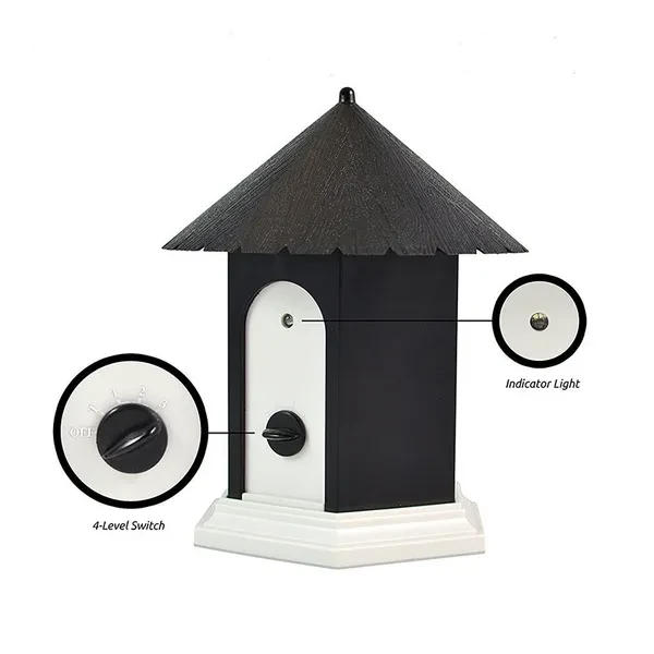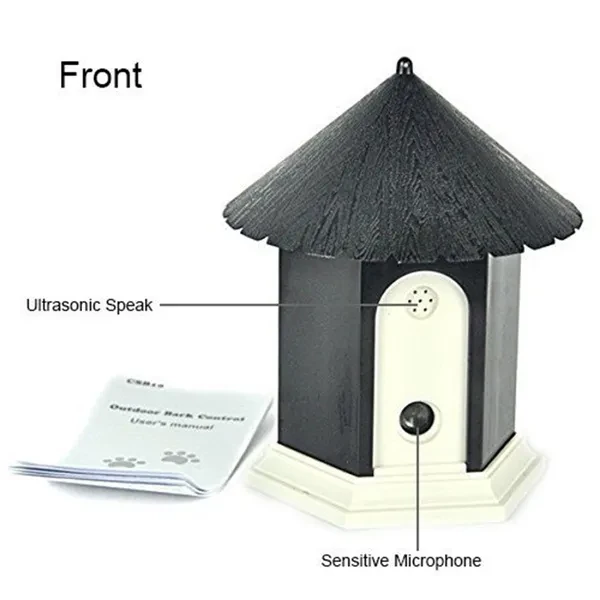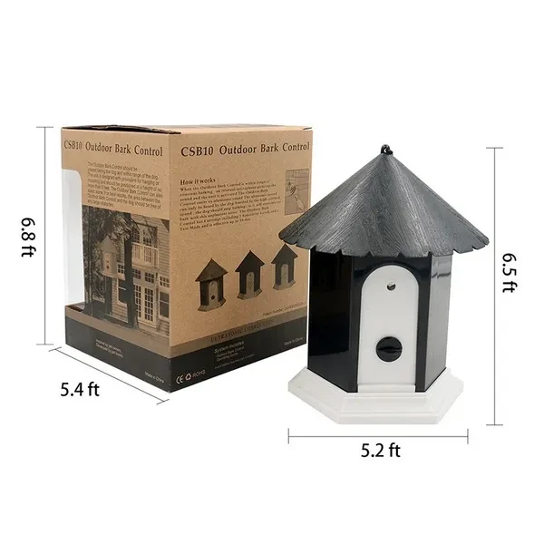 SIZE1:Rectangle Shaped SIZE2:Bird House Shaped SIZE3:House Shaped SIZE4: Dog paw Shaped Uses ultrasonic technology to stop barking, More effective and durable Sensitive microphone isolates and picks up barking up to 50 feet away to stop barking,for outdoor use Four adjustable ultrasonic volume levels – test, low, medium, and high, with LED battery power level indicator Safe and humane method of bark control, suitable for all breeds and sizes of dogs,except for deaf or hearing impaired dogs Pre-assembled, easy set-up, requires low maintenance, and weatherproof (but avoid exposing to very cold or very hot temperatures from 0°C~45°C, 32°F~113°F). Attractive and discreet birdhouse design looks great in your yard Color:Black Specifications: Material: PP Power: 1 * 9V Battery (Battery is not included) LED Color: Green / Red Modes: T: Verify the microphone and speaker are functional 1: Low range(Up to 15 feet) 2: Medium range(Up to 30 feet) 3: High range(Up to 50 feet) Item Size: Approx. 15.5 * 15.5 * 16.5cm / 6.1 * 6.1 * 6.5in (L * W * H) How does it work? Insert a standard 9-volt battery into the Ultrasonic Dog Bark Controller . The unit is automatically activated by the sound of barking. When the device is within the range of a barking dog, the microphone will isolate and pick up the barking to emit an ultrasonic sound to silence the dog. The anti-bark device has three range levels, including a test mode, and is effective up to 50 feet. Note: This product is only suitable for outdoor use. Dont touch by children. The product will not work on deaf or hearing impaired dogs. Human cannot hear the ultrasonic sound, however precautions should be taken when preparing the outdoor bark control for use. The Ourdoor Bark Contral is weatherproof.However,if water enters into the microphone it may disrupt the units operation. After the micorphone is dry it will resume working properly. Whats included: Ultrasonic Dog Bark Controller (battery not included) and user-friendly manual This merchant is committed to only offering products that comply with the General Product Safety Regulation.