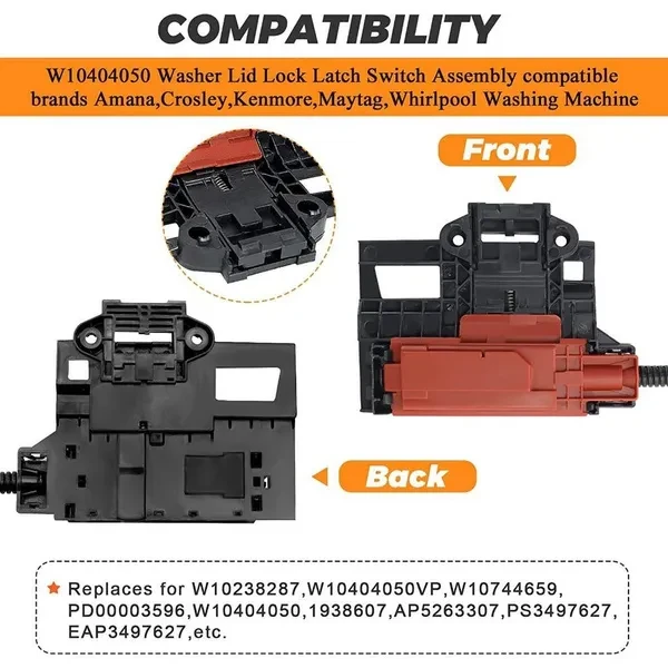 <p>Features: Keep your washing machine lid securely closed during wash and spin cycles with the durable assembly. of strong plastic, this washer door is built-to last and prevent unwanted opening of the lid. This practical tool repairs various symptoms and saves you money on maintenance costs. Perfect for diy repairs at home, the washer lid lock is a must-have accessory for anyone who wants to keep their washing machine running smoothly. Upgrade your washing machine with this reliable and easy-to-install replacement part, and enjoy hassle-free laundry days. Specifications: Material:Plastic Size:As Picture Shown Part Number:W10240513 W10238287 W10404050 For Kenmore-Centennial Maytag-Amana Package Includes: 1x Washer Lid Lock note: ①.Please allow 1-2cm errors due to manual measurement, make sure that you do not mind before you order. ②.Due to the difference between different monitors, the picture may not reflect the actual color of the item. Thanks for your understandings. </p>