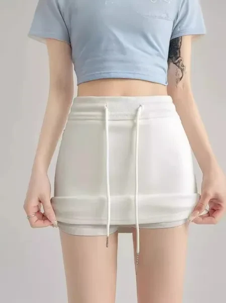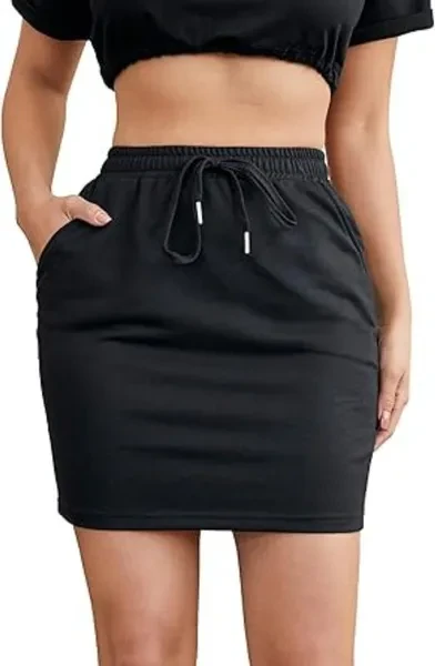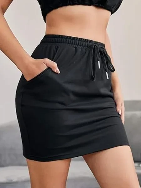 Features: athletic skirt, tennis skirt, golf skirt, high elastic waist, drawstring closure, above knee length, solid color, straight mini skirts, two side pockets for small items