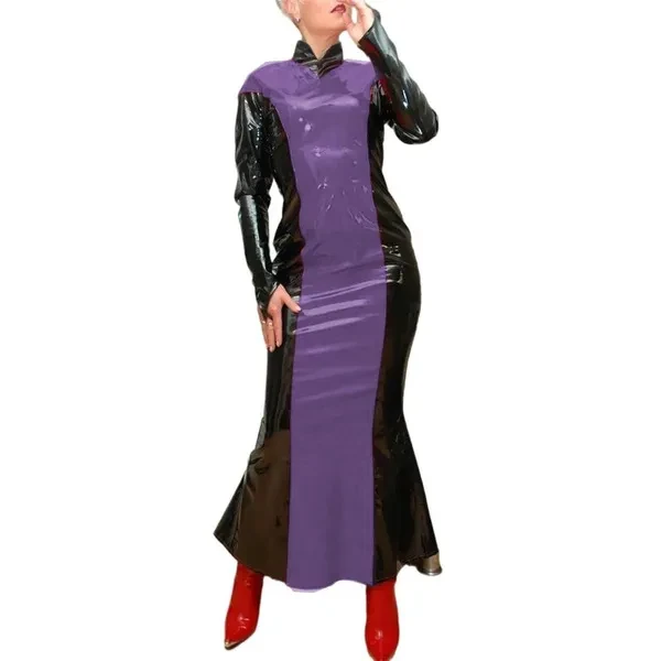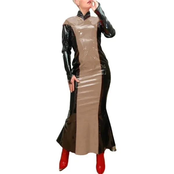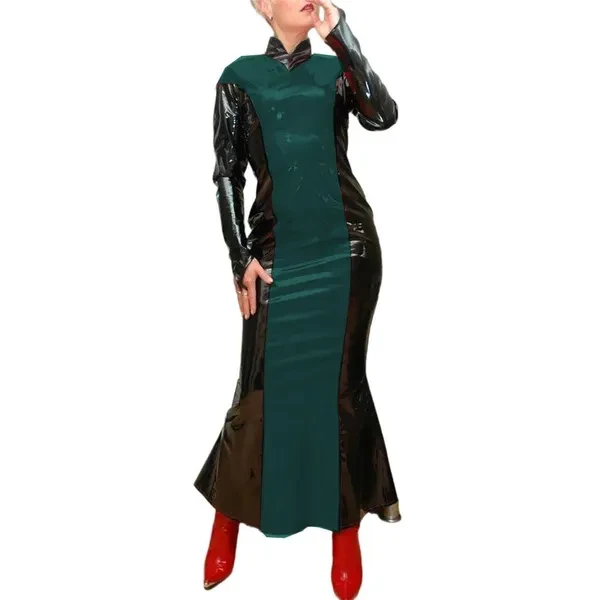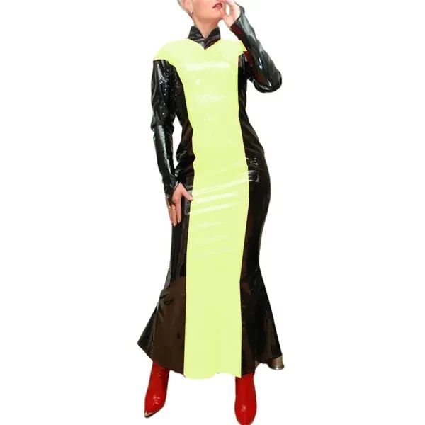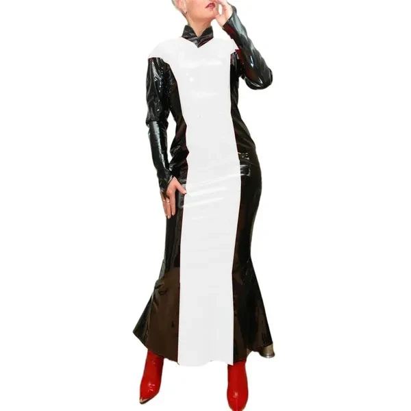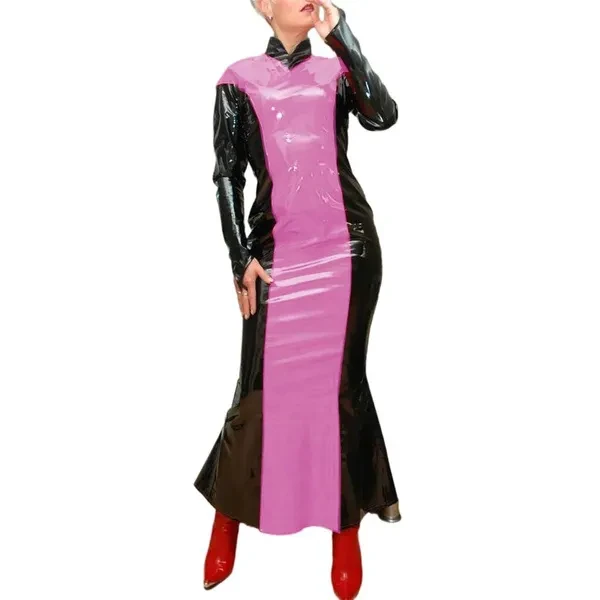 Women High Collar Skinny Patchwork Leather PVC Bodycon Sexy Long Dress Long Sleeve Slim Sheath Dress Mermaid Pencil Dress Party