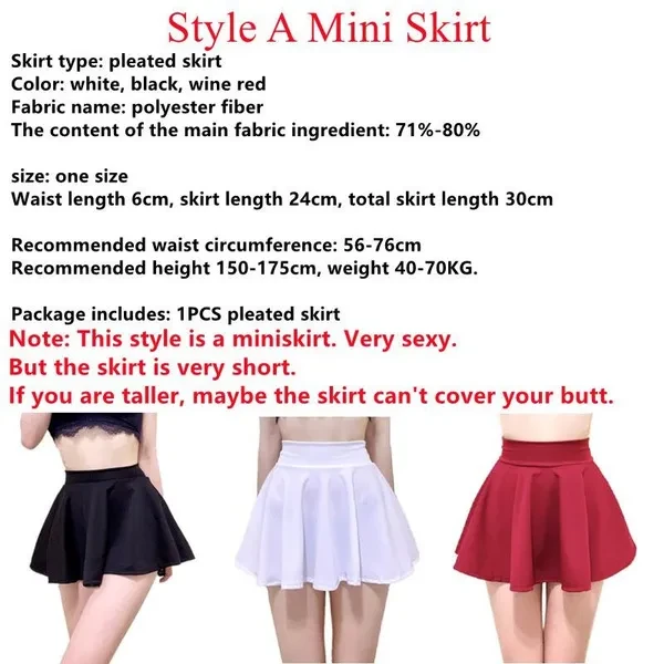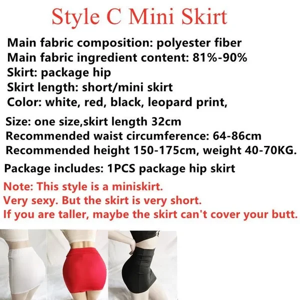 • Style: A,B,C Skirt category: skirt Skirt length: short/mini skirt Skirt type: as the picture shows Color: as the picture shows Fabric : On the details page size: one size Recommended waist circumference: 56-76cm Recommended height 150-175cm, weight 40-70KG. Package includes: 1PCS skirt Note: This style is a miniskirt. Very sexy. But the skirt is very short. If you are taller, maybe the skirt can't cover your butt. Please browse the product pictures carefully and read the product description. Compare sizes. Make sure it suits you. Then make a purchase! Thank you ~