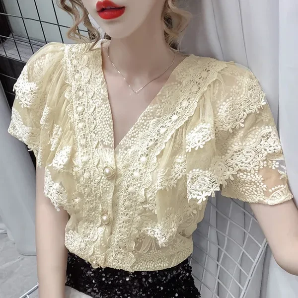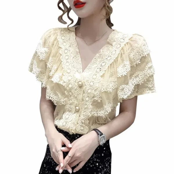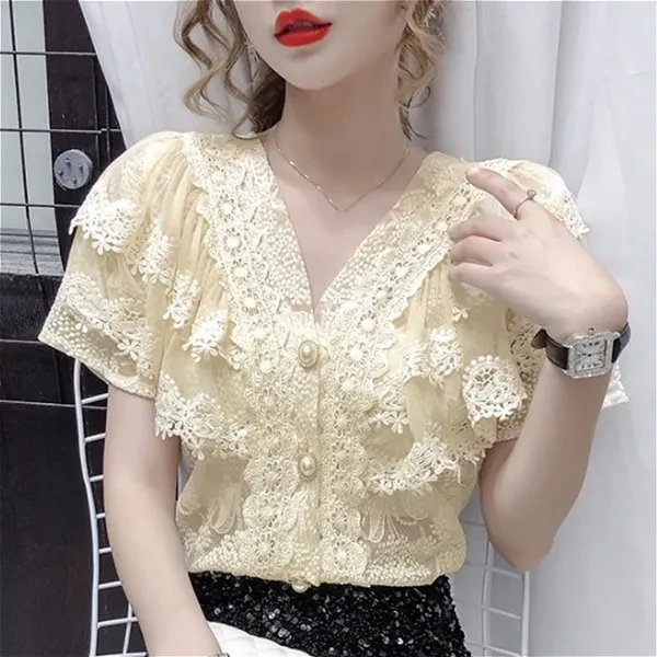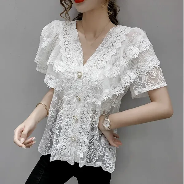 Women Lace Floral Blouse Shirt Top Short Sleeve Ruffle V-neck Sheer Hollow Out
