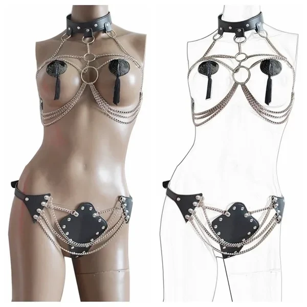 Set Include: 1pc top, 1pc G-string, 1 pair pasties Condition: New without tag Material: PU Leather, Chain Color: (As pictures shown) Features: Womans body harness, snapped collar connected to chains bikini top. One size, fits max neck circumference 40cm, chest 74-94cm. The thong has adjustable straps with buckles, fits waist 74-94cm. Friendly Tips: The size is measured by hands, please allow minor error of measurement. Photo color might be a little different from the actual product due to color display of different monitors.
