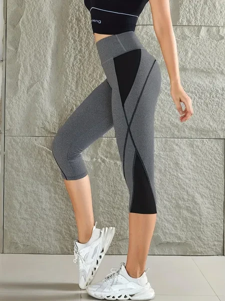 Women's Capri Yoga Pants, High Waist, Stretchy Sports Leggings, Athletic Tummy Control Workout Fitness Cropped Tights With Contrast Mesh Panels