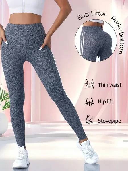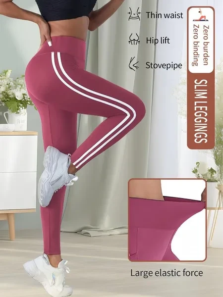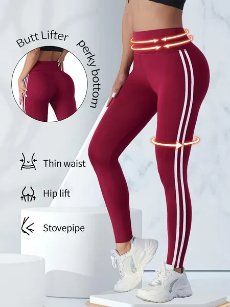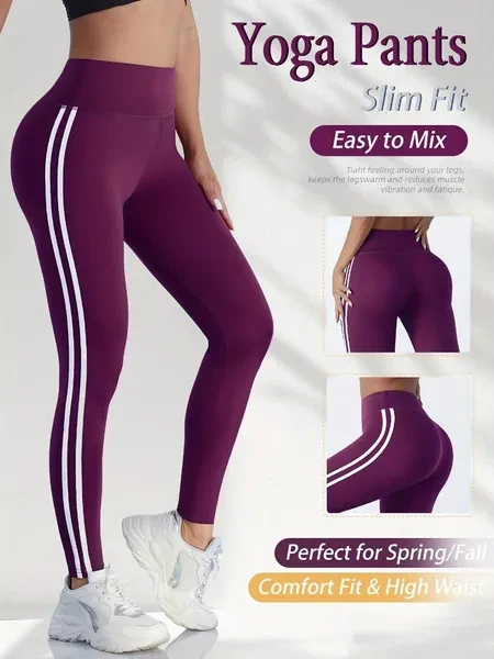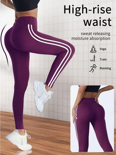 Women'S High Waist Side Striped Yoga Pants, Breathable Sweat-Wicking Sports Leggings for Outdoor Running, Indoor Fitness & Yoga, Butt Lifting Tummy Control, Polyester 92% Elastane 8%, All-Season Knit