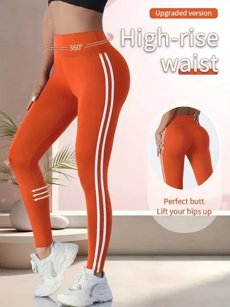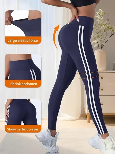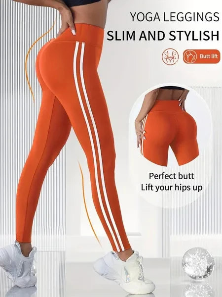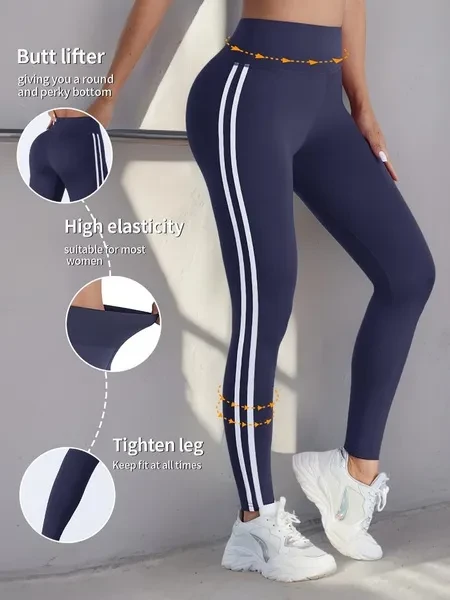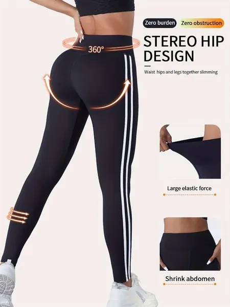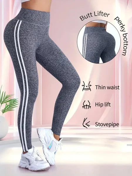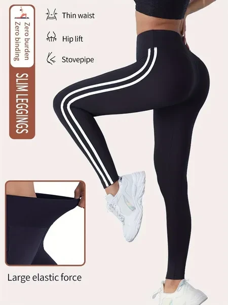 Women'S High Waist Side Striped Yoga Pants, Breathable Sweat-Wicking Sports Leggings for Outdoor Running, Indoor Fitness & Yoga, Butt Lifting Tummy Control, Polyester 92% Elastane 8%, All-Season Knit