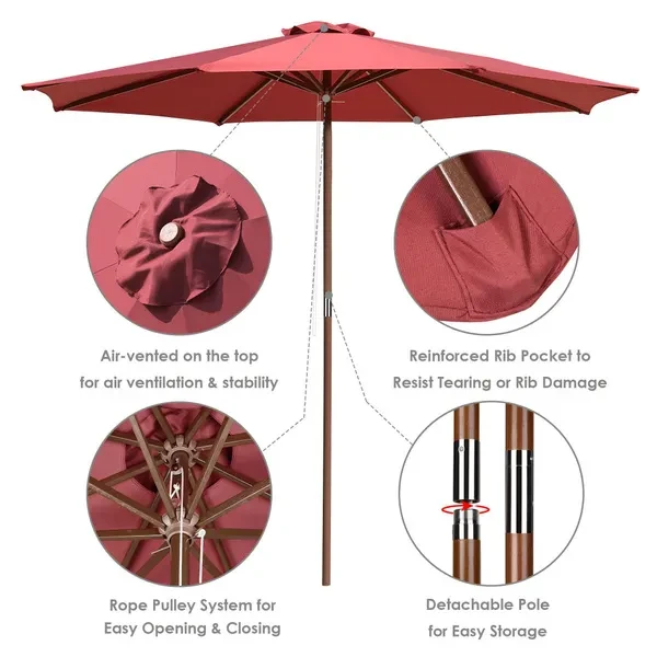Features: - This 9ft 8 ribs retro wooden frame patio umbrella is classic and never out of date, which provides not only shade but special scenery for your patio, garden, deck, backyard, pool - Durable 180g polyester fabric cover: - UV30+ Protection - Effectively protect you from being harmed under sunlight, can be also used when drizzling - Fade Resistant - Color fastness up to European Standard level 3, keeps original color under sun exposure longer than those without any anti-fade technology - Easy Storage - A free strap included to bind umbrella canopy for convenient storage Specifications: - Overall Dimension(LxWxH): 108" x 108" x 95 11/16" (274.32 x 274.32 x 243 cm) - Umbrella Canopy Dimension(LxW): 108" x 108" (274.32 x 274.32 cm) - Pole Dia.: 1 1/2" (38 mm) - Bare Umbrella Pole Length After Closing: 41 5/8"(106cm) - Rib Quantity: 8 - Color: White / Terra Package Contents: - 1x Patio Umbrella - 1x Pole - 1x Strap - 1x Manual