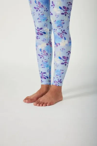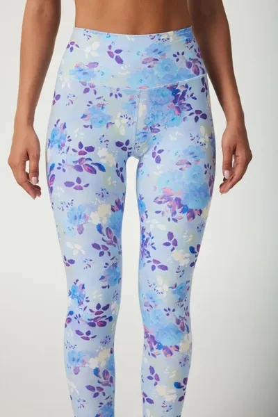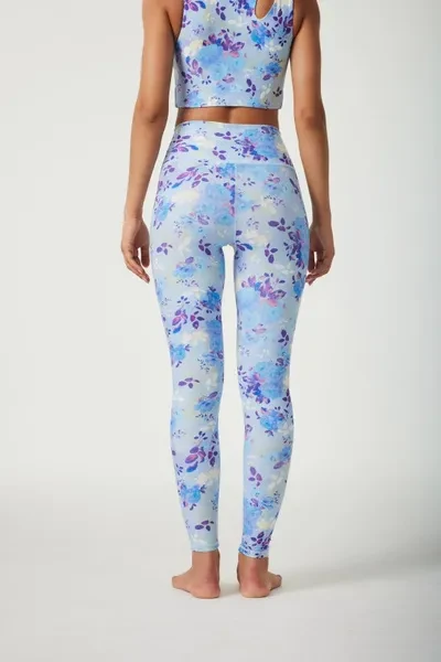 Pattern Description: Our Flower Dance takes inspiration from the blooming flowers that dance gracefully under the night sky, caressed by a gentle evening breeze. The blossoming flowers symbolize the strength and resilience of women, as they gracefully navigate the challenges of life. The mesmerizing blue hues reflect a sense of calmness and tranquility, creating a rich and dreamy vibe and letting you immerse yourself in its embrace. Product Features: High-waisted design perfectly shapes support and flatters any body types No small elastic band at the top No side seams for extra flattering fit and comfort Pair it with our matching Flower Dance Cutout Shoulder Sports Bra  for a totally unique and dreamy look Fabric: Made with 84% RPET and 16% spandex from recycled plastic bottles and it is 100% recyclable! - Four-way stretch, breathable and anti-bacterial. Model Info: Melania // Height: 5'9  // Bust 33.1” //  Waist 23.6” // Hips 39.0” // SILVERWIND size S in tops & botto