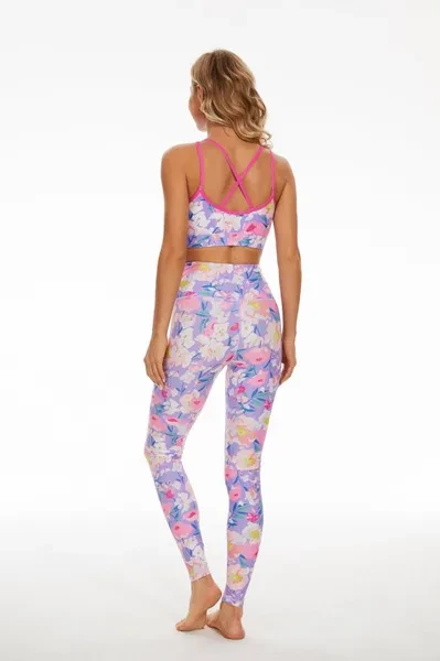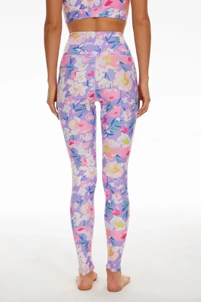 Pattern Description: Set against a backdrop of purple and pink hues, our designer used the abstract artistry of watercolor to portray an array of beautiful flowers. It's a vivid symbol of feminine confidence, beauty, and charm, offering a perfect blend of romance and vivacity. As you move through your yoga sequences or workout routines, this design not only enhances the aesthetic appeal of your attire but also energizes your fitness journey with its lively and romantic atmosphere. Product Features: High-waisted design perfectly shapes, supports, and flatters any body types No small elastic band at the top A hidden pocket at the back No side seams for extra flattering fit and comfort Fabric: Made with 84% RPET and 16% spandex from recycled plastic bottles and it is 100% recyclable! - Four-way stretch, breathable and anti-bacterial. Model Info: Juliana // Height: 5'8  // Bust 33.1” //  Waist 23.6” // Hips 35.8 // SILVERWIND size Regular S