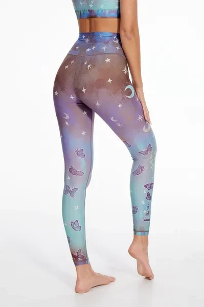 Pattern Description: The designer uses interweaving dreamy blue and green and purple as the base color, and textures of butterfly wings to create the pattern. The butterfly on the right foot changes from small to large, symbolizing the butterfly breaking out of its cocoon and soaring freely, also reflecting the beauty of women's transformation. Product Features: High-waisted design perfectly shapes, supports and flatters any body types No small elastic band at the top No side seams for extra flattering fit and comfort Fabric: Made with 84% RPET and 16% spandex from recycled plastic bottles and it is 100% recyclable! - Four-way stretch, breathable and anti-bacterial. Model Info: Maria// Height: 5'74 // Bust 33.9” //Waist 24.0” // Hips 35.4 //SILVERWIND size Regular S