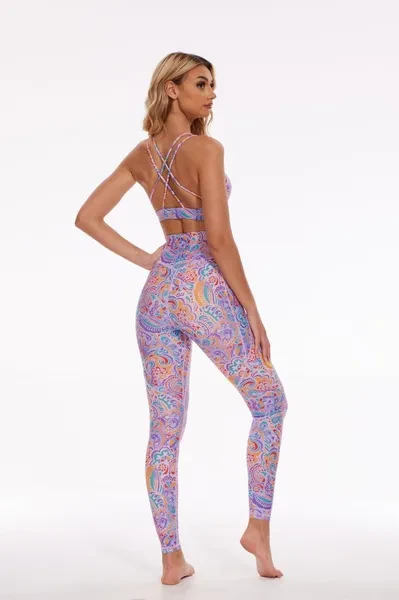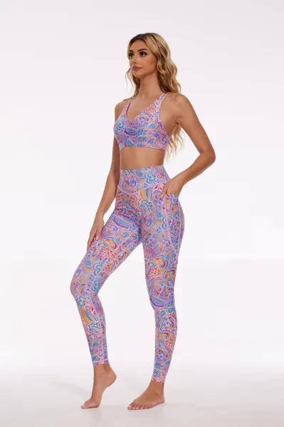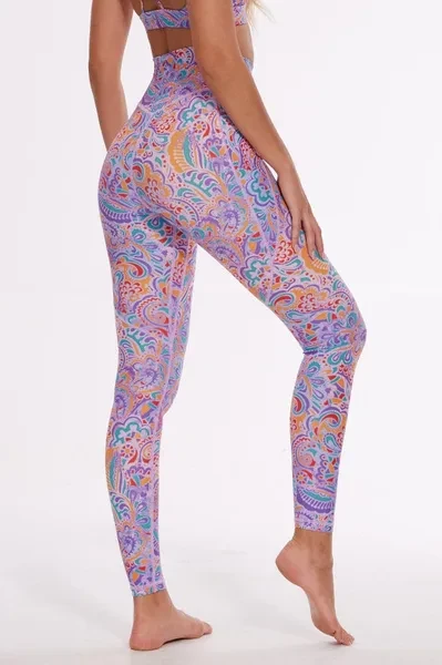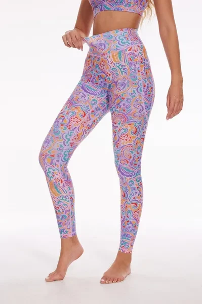 Pattern Description: Symbolizing eternity and immortality, Paisley pattern is a representation of the bohemian culture, embodying a spirit of rebellion and disdain for conformity. The unique paisley pattern, featuring a regal purple backdrop, exudes a profound and enigmatic charm. Our designer draws the rich floral elements in shades of orange, blue, green, and pink. Each element has its own unique shape and brightness, creating a mesmerizing visual sensation. The patterns cascade and swirl like eddies, imbuing the overall design with both energy and harmony. Product Features: High-waisted design perfectly shapes, supports and flatters any body types. No small elastic band at the top. Two side pockets for essentials. No side seams for extra flattering fit and comfort. Stretchy and light fabric for a smoothing, second-skin feel. Fabric: Made with 84% RPET and 16% spandex from recycled plastic bottles and it is 100% recyclable! - Four-way stretch, breathable and anti-bacterial. Model Info: Evy // Height: 5'8  // Bust 33.9” //  Waist 24.4” // Hips 36.6 // SILVERWIND size Regular S